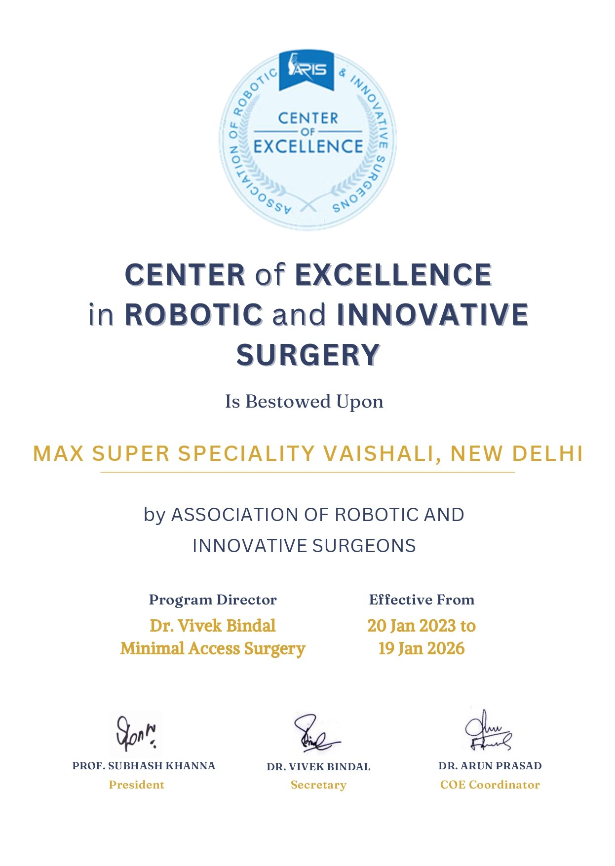 Posted on Sneha PundhirTrustindex verifies that the original source of the review is Google. Excellent experience with sir very supportivePosted on lalit kumarTrustindex verifies that the original source of the review is Google. "आदरणीय डॉ. विवेक बिंदल सर, मैं हृदय की गहराइयों से आपका आभार प्रकट करता हूँ कि आपने मेरी स्लीव गैस्ट्रेक्टोमी की सर्जरी को सफलतापूर्वक संपन्न किया। आपके कुशल हाथों और मार्गदर्शन के लिए मैं सदैव कृतज्ञ रहूँगा।"Posted on Rajesh JoshiTrustindex verifies that the original source of the review is Google. My father Dr K B Joshi who is 86 years old detected with Hernia, due to his age and related risk factors I was searching for the Doctor who is expert in this field, after extensive search I could find out that Dr Vivek Bindal is the best Robotic Surgeon in India, who is associated with Max Hospitals Vaishali Ghaziabad UP. My father who is himself a doctor was extremely pleased with the approach, diagnosis and clarity of thoughts with confidence of Dr Vivek Bindal, based on his advice we decided to go ahead with the operation, after completing all the diagnostic tests the operation was performed very successfully by Dr Vivek, his treatment, approach towards the patient & extra ordinary skills to perform surgery under high risk was beyond appreciation. We thank Dr Vivek Bindal from bottom of our heart and wish him all the very best for his noble work in the field of Robotic Surgery and excellent service to the mankind! Rajesh K Joshi. Managing Director STP Ltd, (A Berger Paints Group Company) Delhi, India.Posted on Ankit KumarTrustindex verifies that the original source of the review is Google. Dr. Vivek Bindal is an exceptional surgeon. My mother was diagnosed with gallbladder stones and a bile duct stone, and we consulted him for treatment. He explained everything clearly, guided us through the entire process, and performed the surgery with great expertise. A big thank you to Nikhil Bhaiya as well for their constant support and smooth coordination throughout the process. Thanks to him, the procedure went smoothly and my mother is recovering well. Highly recommended!Posted on Hemant AgarwalTrustindex verifies that the original source of the review is Google. There are many good doctors but the empathy with Dr. Bindal brings with him can make all the differencePosted on Nitish GoelTrustindex verifies that the original source of the review is Google. I would like to extend my heartfelt gratitude to Dr. Bindal and his entire team for the exceptional care they provided during my mother’s (VEENA GOEL ) COMPLEX INCISIONAL HERNIA Surgery through robotic method. From the very first consultation to the post-surgery follow-ups, Dr. Bindal and his team were incredibly professional and supportive. We are truly grateful for their outstanding care and highly recommend Dr. BINDAL and their whole team .DR BINDAL IS very softspoken and helpful for making a positive mindset of the patient #REGARDS #DR VIVEK BINDAL #HERNIA #ROBOTIC SURGERYPosted on Pravin GuptaTrustindex verifies that the original source of the review is Google. I have undergone Achalasia Cardia type 1from Dr Vivek Bindal today in Max Hospital Vaishali. I am really very much impressed with the competence and behavior of Dr Bindal and its team. Besides his professionalism acumen his nature to explain things to patient and its relatives is per excellence. It is rarely seen with senior doctors.Posted on Mayank Kumar SharmaTrustindex verifies that the original source of the review is Google. Dr Vivek Bindal is incredibly knowledgeable and took the time to answer all my questions. He handled my case with great care and professionalism. He ensured all test were done quickly and performed robotic surgery. I was able to walk after couple of hours from my surgery and got discharged within 24 hours post-surgery. Forever greatful for his expertise and the entire Max hospital team.