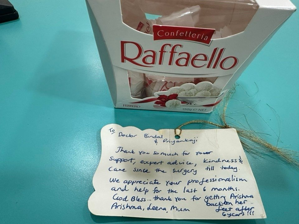 A wonderful note of thanks by Areshma and her family along with chocolates made our day.